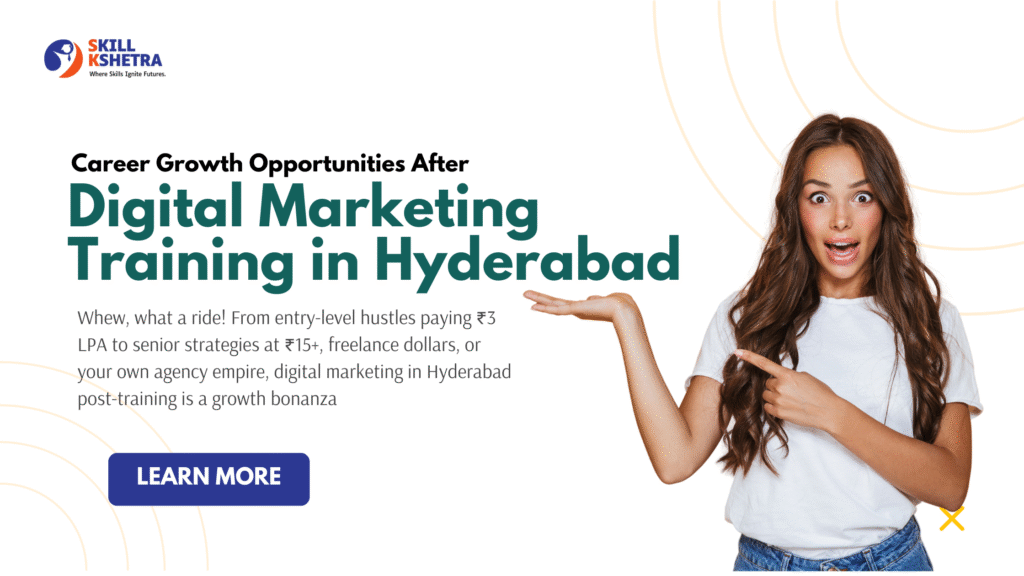 You’re buzzing with excitement, but that little voice in your head whispers, “Okay, now what? How do I turn this into a killer career?” If that’s you, pull up a chair (or your favorite chai spot)—we’re about to chat about the incredible career growth opportunities waiting for you right here in Hyderabad after your training. In 2025, with our city’s tech scene exploding like a Diwali fireworks show, digital marketing isn’t just a job; it’s a launchpad to six-figure salaries, global freelancing gigs, and even your own agency. We’ll dive deep into entry-level starts, mid-career leaps, senior boss vibes, freelance freedom, and entrepreneurial dreams—all tailored for freshers like you. By the end, you’ll see why investing in training (like at Skill Kshetra) is the smartest move you’ll make. Let’s roll!